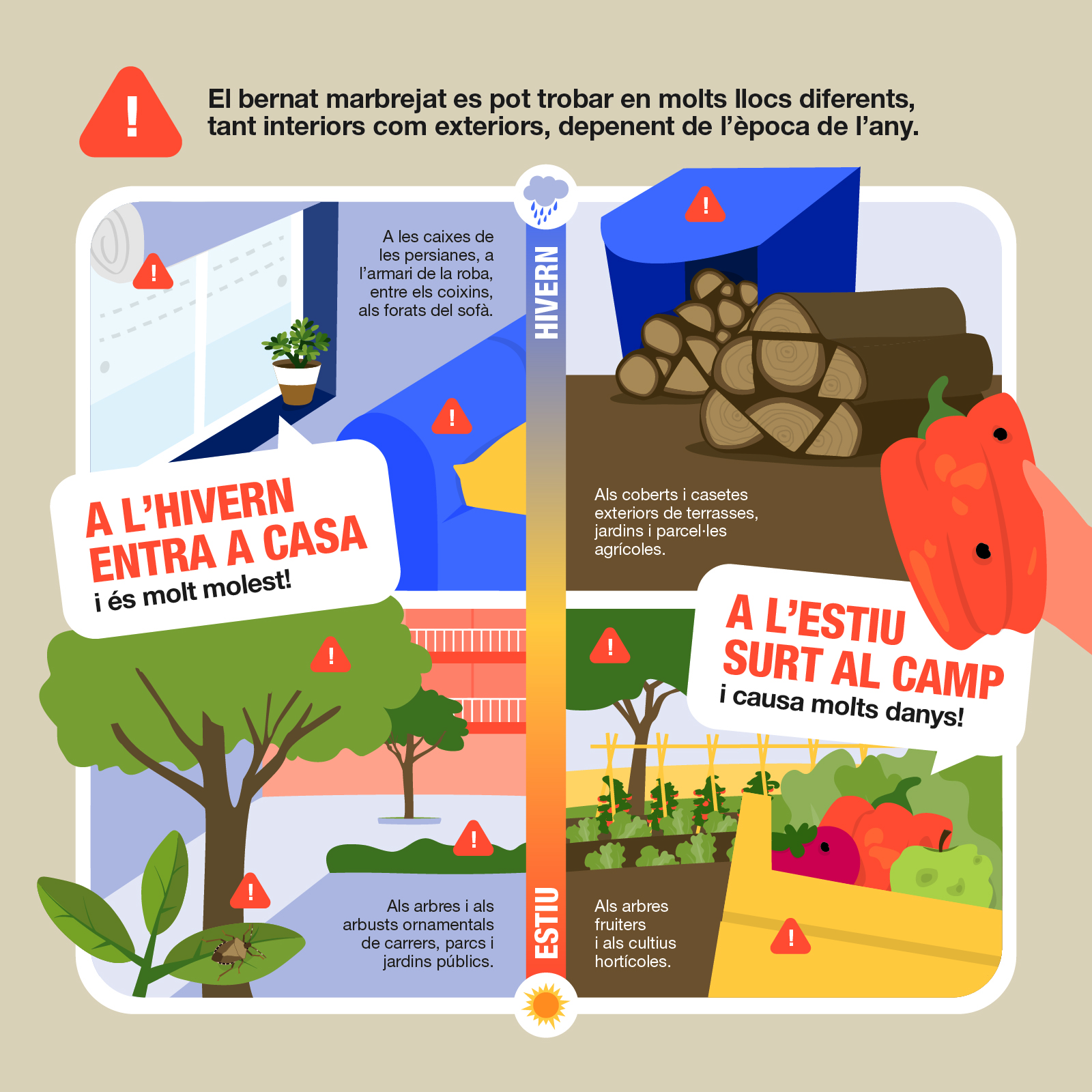 El bernat marbrejat és un insecte invasor d’origen asiàtic que s’ha convertit en plaga. A la primavera i estiu ataca els cultius de fruita i hortalisses i passa l’hivern a cases i edificis, aprofitant els petits forats que pot trobar per entrar-hi.