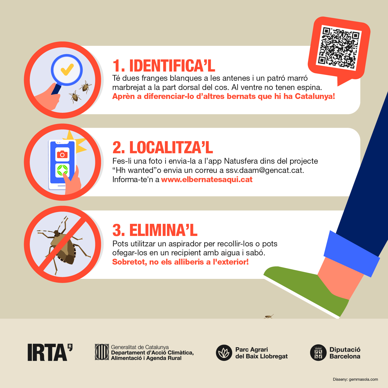 - Localitza’l: Fes-li una foto i envia-la a l’app Natusfera dins del projecte “Hh wanted” o envia un correu a ssv.daam@gencat.cat
