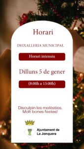*Horari: dilluns i dijous de 08 h a 13.30 h i de 16 h a 18 h i dissabte de 09 h a 12 h.
