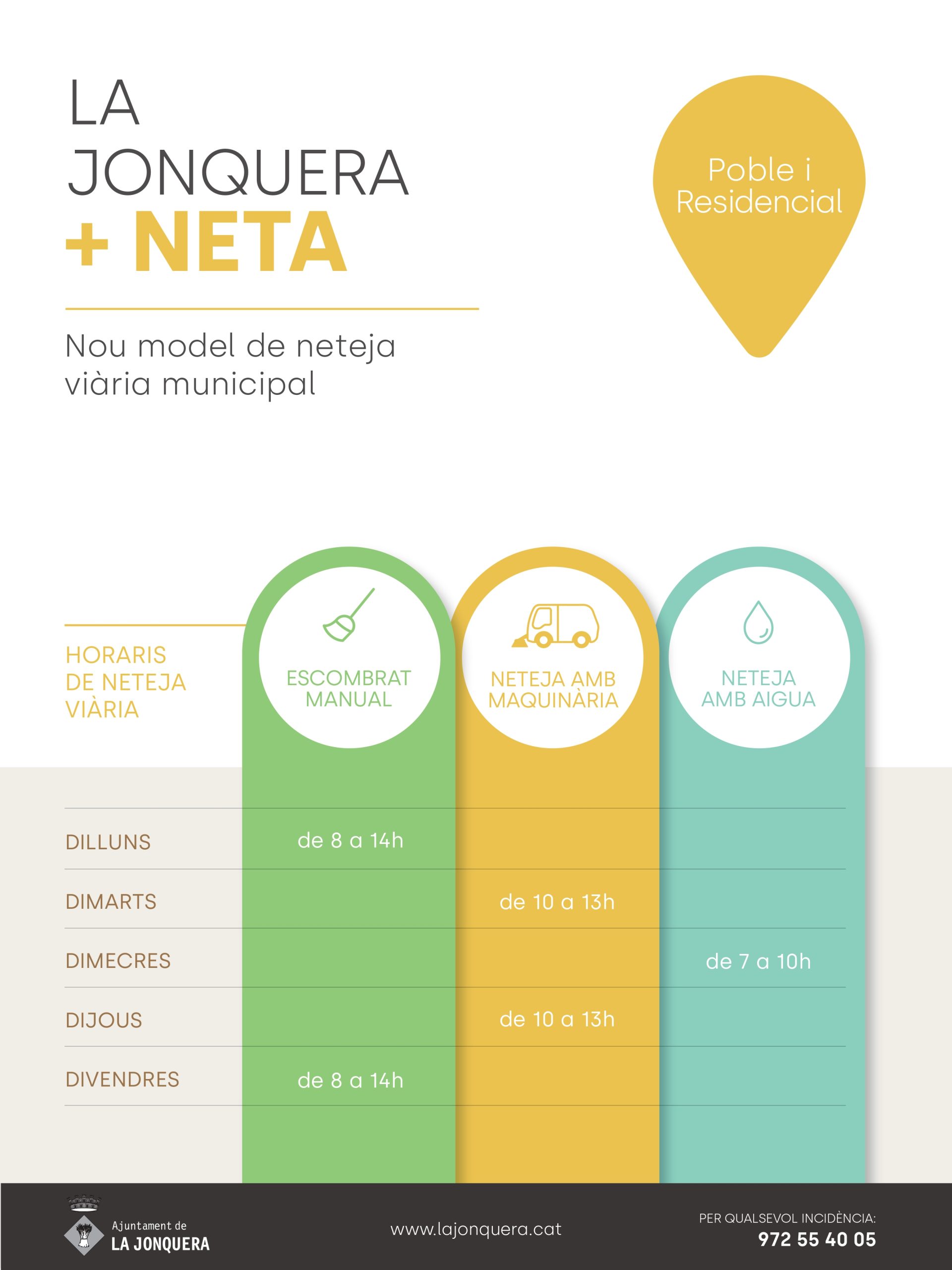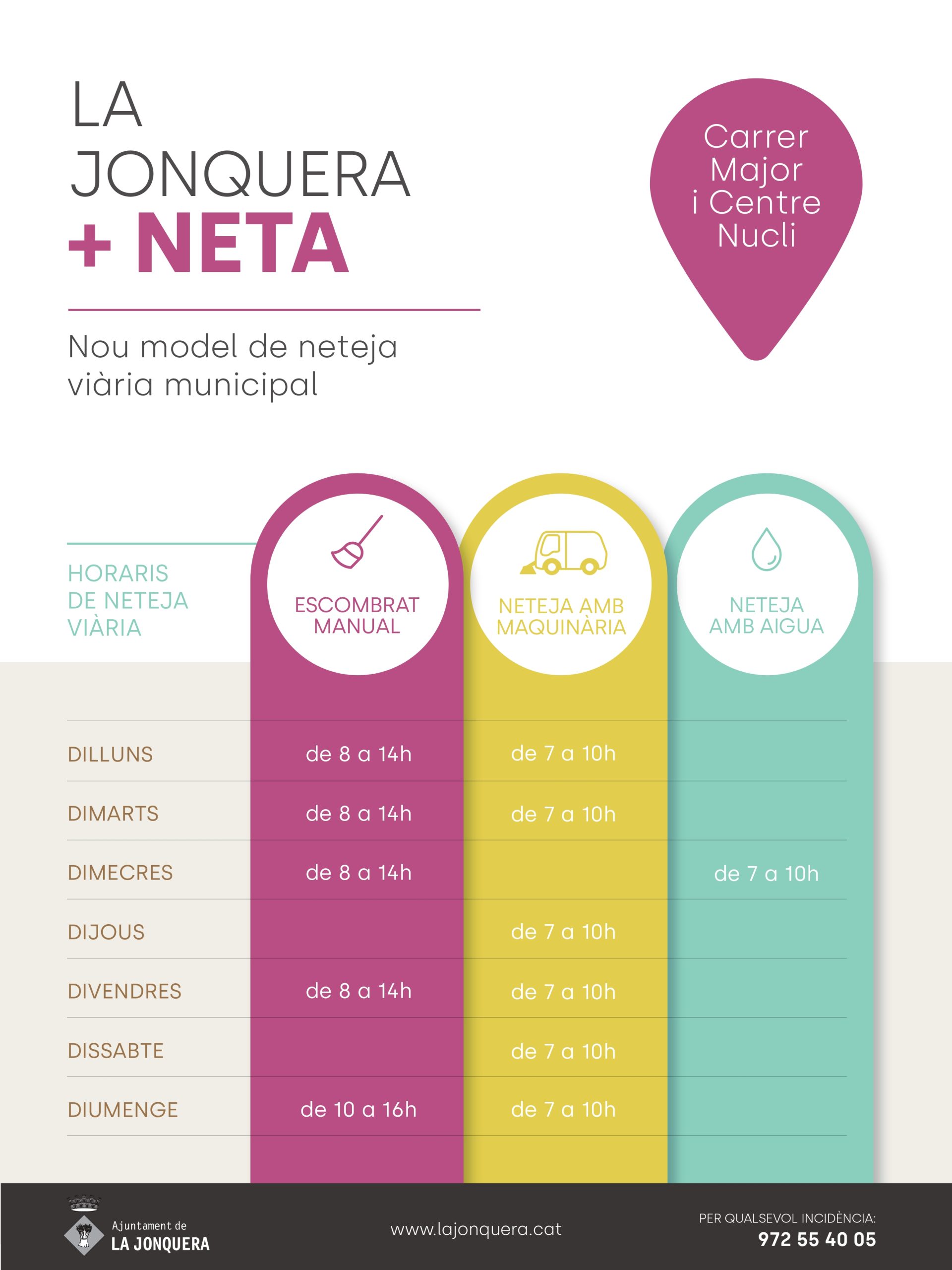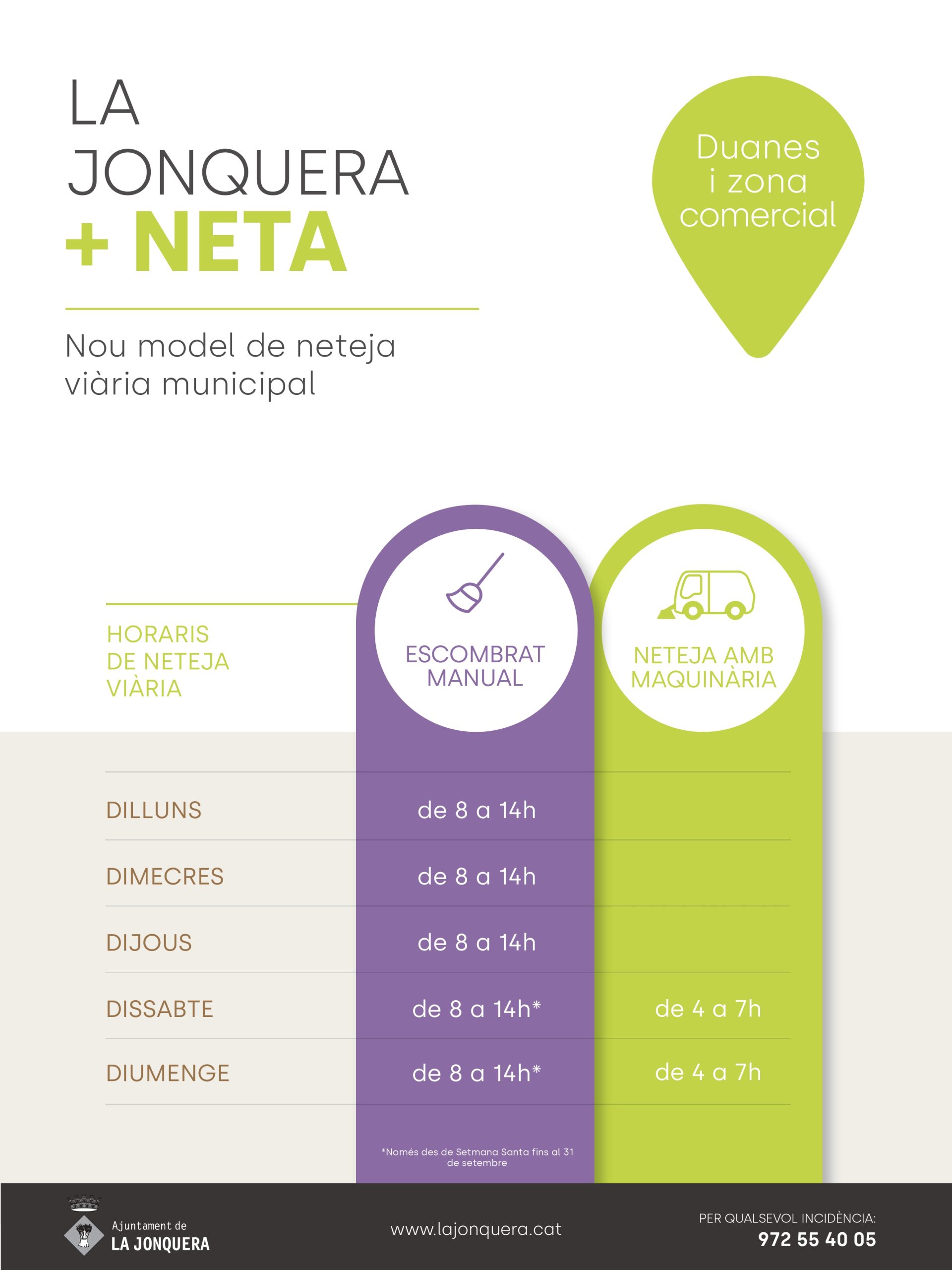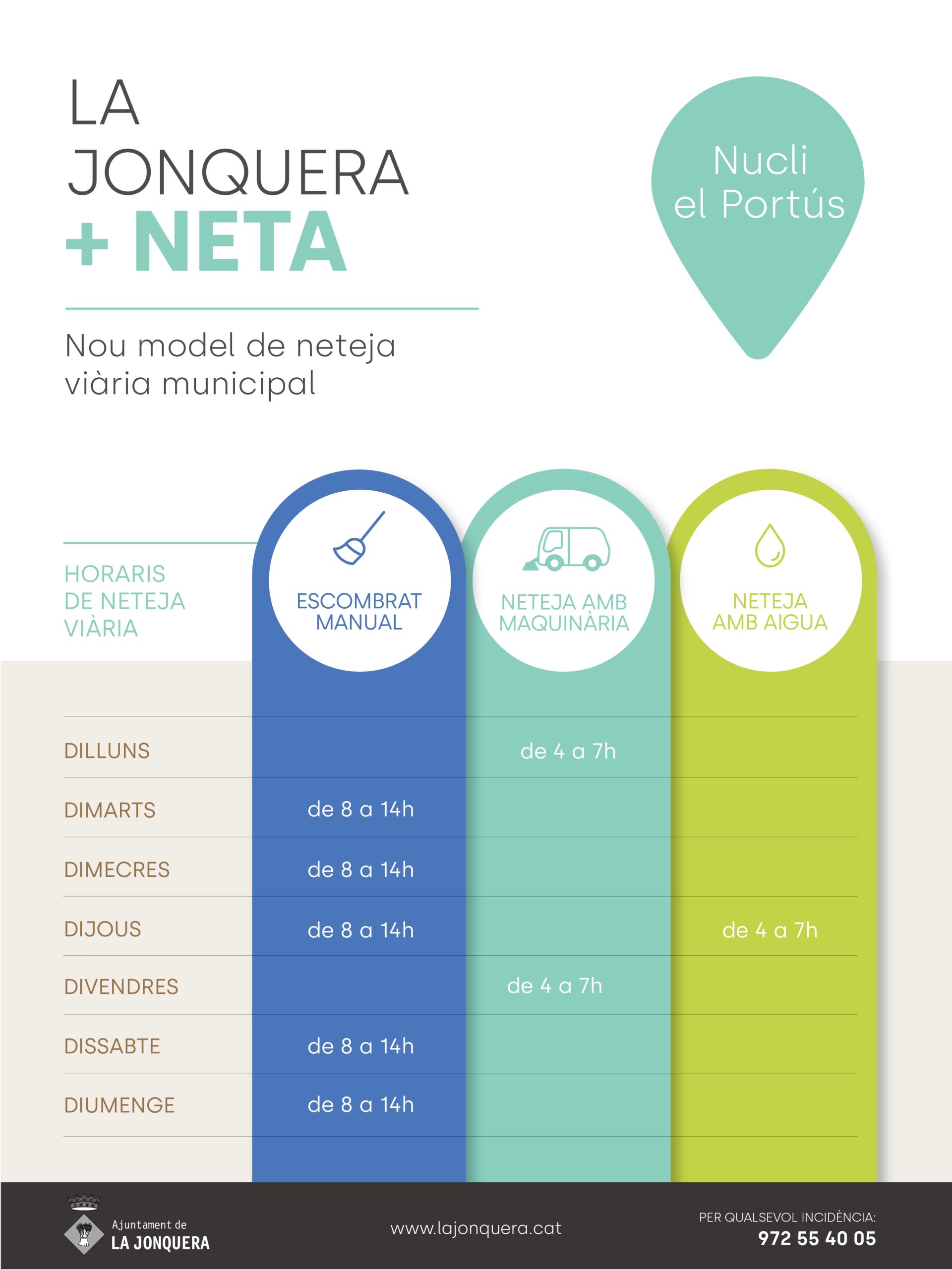 Des de l’abril del 2023 la Jonquera disposa d’un nou model de neteja viària amb major freqüència i serveis. Es combinen tres sistemes de neteja per assegurar un correcte estat de neteja i salubritat de la via pública, són: